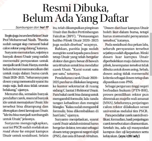 | Jawa Pos | Cetak | 17, 27 | Selasa, 21 Januari 2020 | Resmi Dibuka, Belum Ada Yang Daftar | Pendidikan (Berita tentang seleksi calon rektor Unair) |