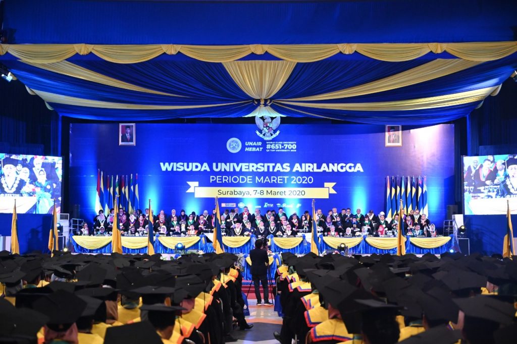 UNAIR NEWS – Pengukuhan wisudawan Universitas Airlangga (UNAIR) yang digelar pada Minggu (8/3/2020) berjalan dengan sangat khidmat. Dibuka dengan iringan